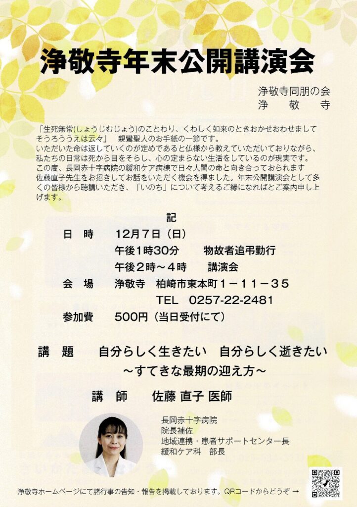 例年「物故者追弔法会 兼 年末法話会」として御法話をお聞きしておりますが、今年は「公開講演会」として開催し、長岡赤十字病院の緩和ケア科の医師・佐藤直子先生からお話いただきます。